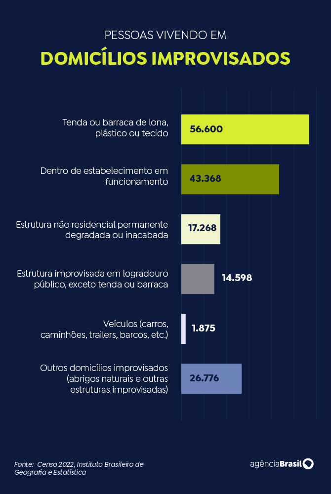 O Censo 2022 mostrou que 196,2 mil brasileiros viviam em domicílios improvisados ou em abrigos no país, naquele ano. Isso representa cerca de 0,1% do total da população total brasileira (203,1 milhões), segundo o levantamento censitário.