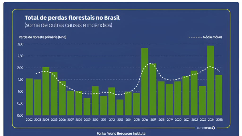 Para os pesquisadores, o resultado observado no Brasil impactou positivamente os dados globais, que apontam uma perda de 4,3 milhões de hectares de cobertura arbórea em floresta tropical úmida em todo o mundo, no ano de 2025.