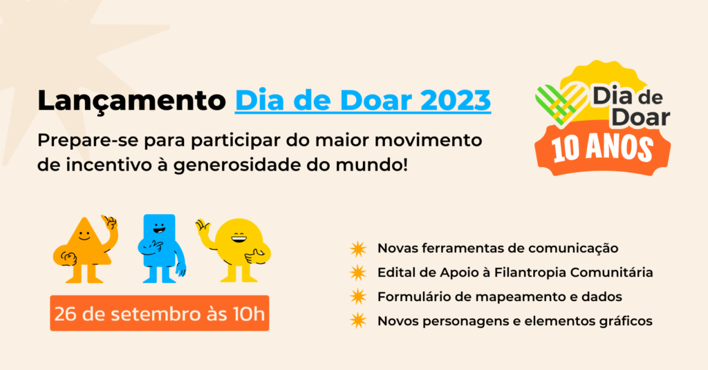 No próximo 26 de setembro, a partir das 10h, ocorrerá o lançamento do “Dia de Doar 2023: quem doa, transforma”. Realizado no formato de webinar, o evento trará orientações para que as organizações do Terceiro Setor possam aproveitar ao máximo a mais importante campanha sobre filantropia no Brasil. A participação é gratuita, aberta a qualquer participante, de qualquer lugar do país.