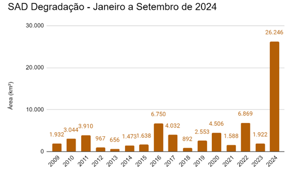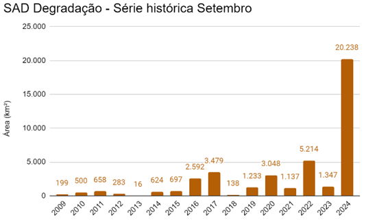 Além disso, setembro foi o quarto mês consecutivo com aumento nas áreas degradadas. Fato que contribuiu para que o acumulado desde janeiro também fosse o maior dos últimos quinze anos, atingindo 26.246 km². Antes disso, o recorde para o período era de 2022, quando a degradação somou 6.869 km². Ou seja: quase quatro vezes menos do que em 2024.