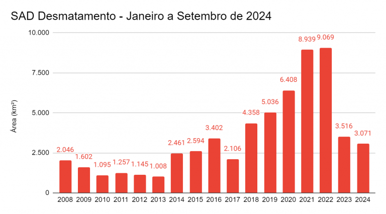 Já ao se observar o acumulado de janeiro a setembro, a área desmatada foi de 3.071 km², a oitava maior da série histórica.
