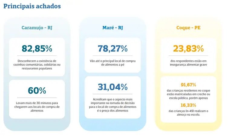 Já no Caramujo, também no estado do Rio, o estudo identificou dificuldades no abastecimento alimentar. “Cerca de 60% dos respondentes levam mais de 30 minutos para chegar aos locais de compra. Esse dado alerta para a fragilidade do acesso físico aos alimentos e reforça a necessidade de ações que garantam disponibilidade e qualidade alimentar nesses territórios”, disse Rangel.