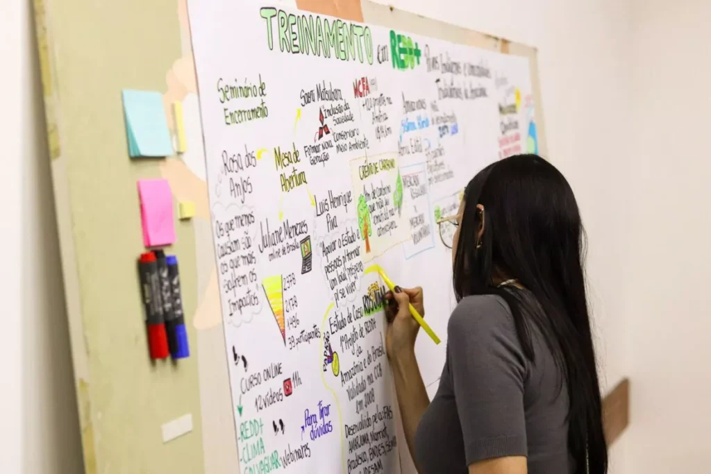 No segundo dia de seminário, as pessoas participantes se engajaram na criação de um Mapa de Ação, utilizando a metodologia de cartografia social. Em grupos, foram identificadas ações necessárias para implementar o REDD+ em seus territórios, considerando recursos disponíveis, desafios e potenciais parceiros. Cada grupo desenvolveu um mapa visual que representou suas propostas e reflexões, apresentada em uma plenária final, promovendo a troca de experiências e colaboração.