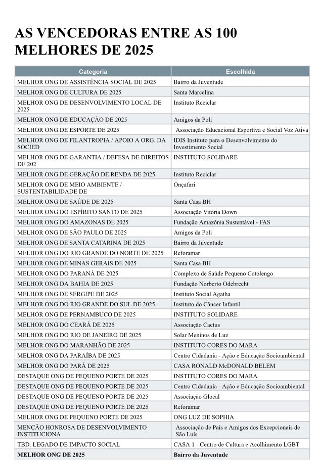 Em 2025, quase 900 instituições se inscreveram — um recorde que, segundo os organizadores, indica amadurecimento do setor. A lista completa das 100 Melhores está disponível no site oficial(premiomelhores.org/2025), que também abre as inscrições para as ONGs interessadas em participarda edição seguinte.