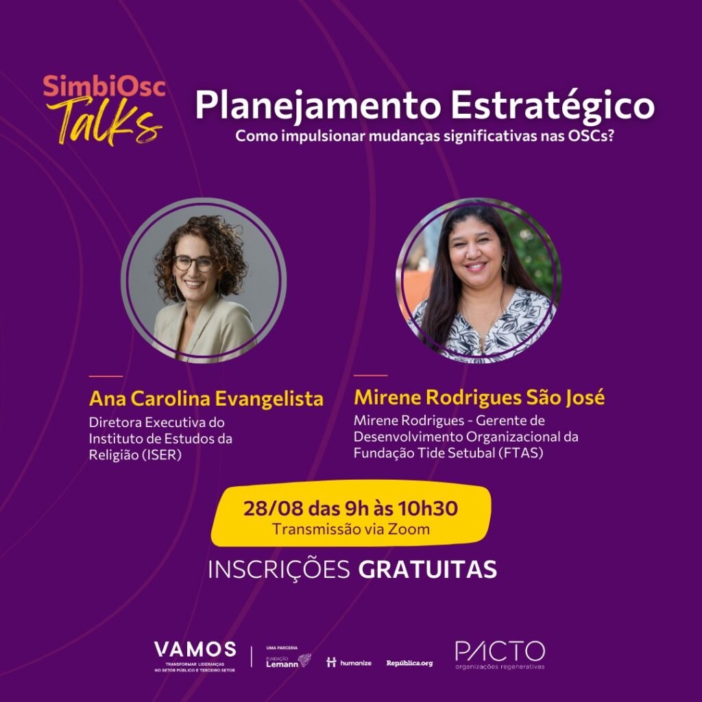O SimbiOsc, comunidade de aprendizagem e desenvolvimento de organizações da sociedade civil irá realizar o workshop SimbiOsc Talks. Com o tema “Planejamento Estratégico: Como impulsionar mudanças significativas nas OSCs?”, o encontro reunirá especialistas que compartilharão suas vivências e os desafios enfrentados durante a elaboração e implementação de planos estratégicos em suas respectivas organizações.